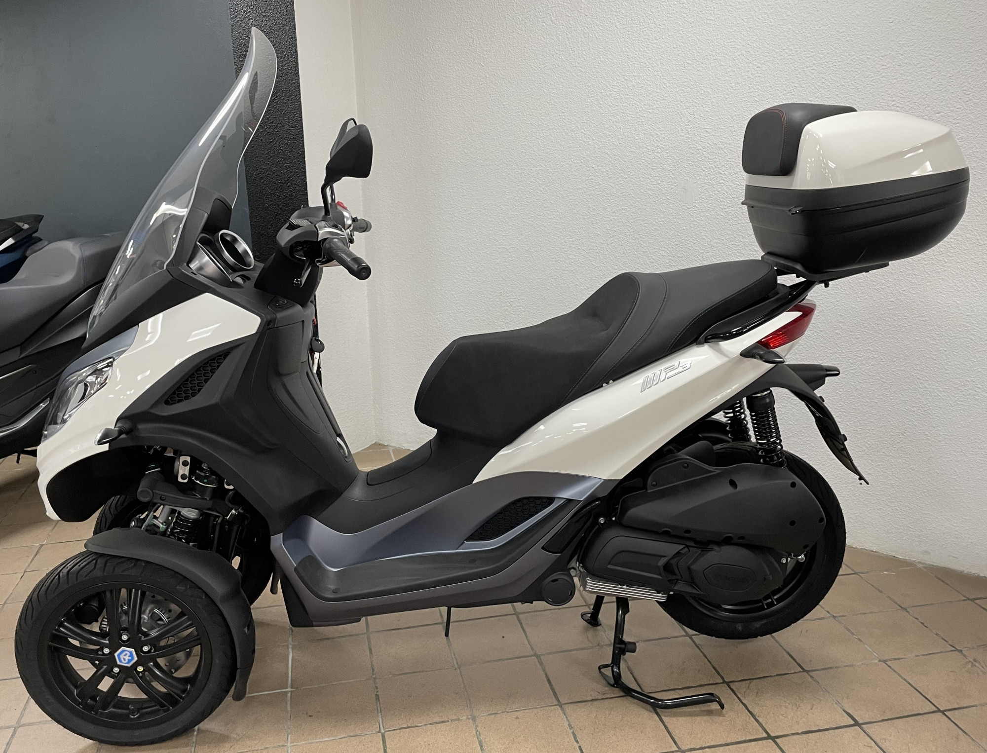 piaggio mp3 300 hpe en destokage modèle neuf norme euro 5 couleur blanc avec cravate bleu