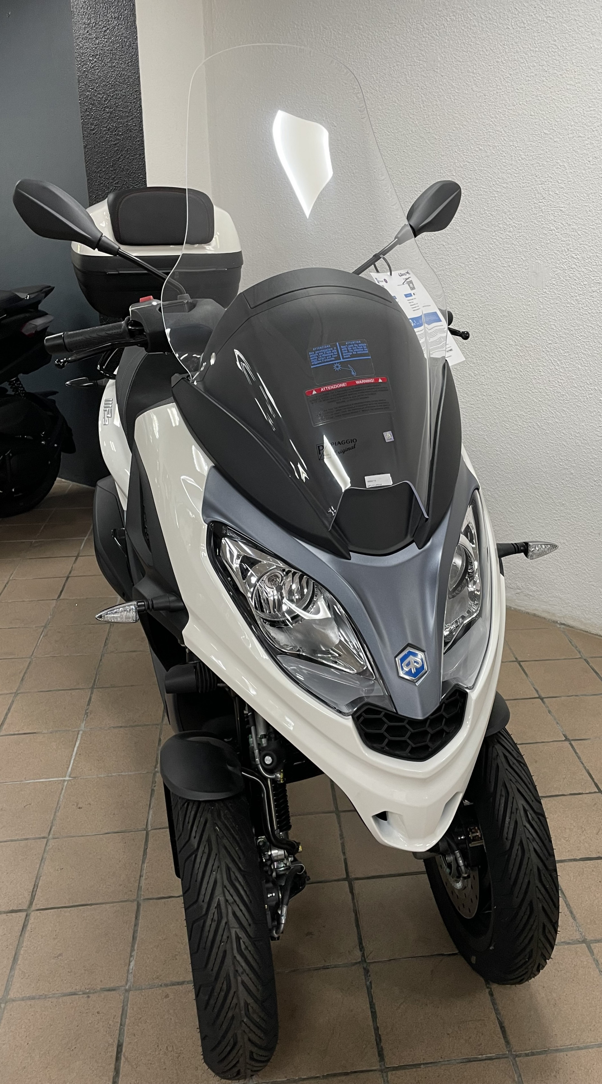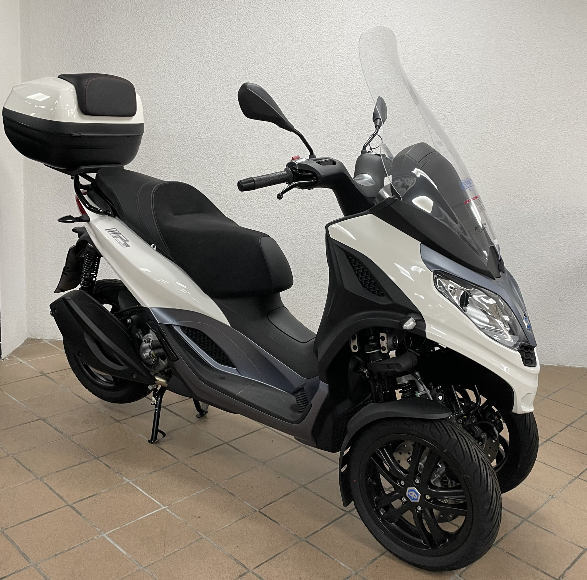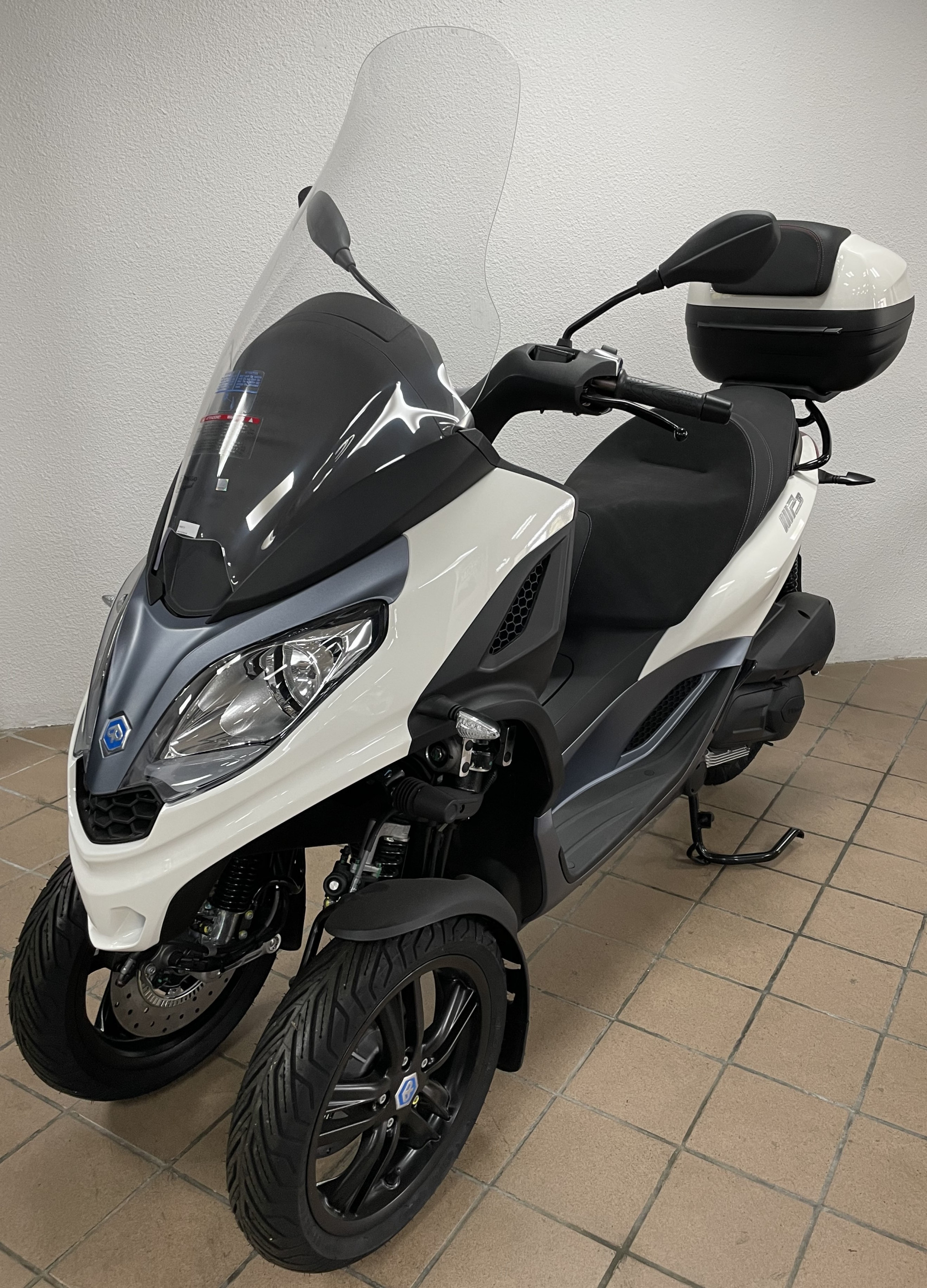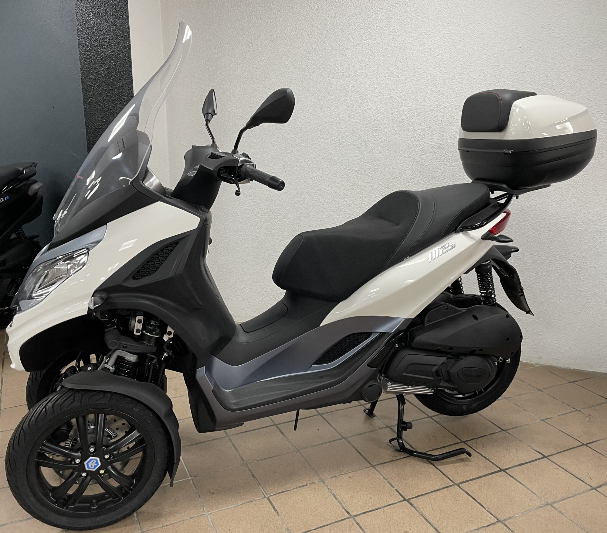 piaggio mp3 300 hpe en destokage modèle neuf norme euro 5 couleur blanc avec cravate bleu